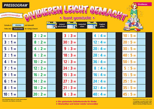 Mit trocken-abwischbarem Folienstift werden die Resultate in die vorgesehen Rubriken geschrieben und können anschließend kontrolliert werden. Der neben den Aufgaben liegende Zauberstreifen reagiert auf Wärme und wird durch Drücken und Reiben mit dem Finger aktiviert - das Resultat wird kurzfristig sichtbar. Nach einigen Sekunden wird das Feld dann durch das Absinken der Temperatur wieder undurchsichtig. Diese Umkehrreaktion ist immer wieder aktivierbar.